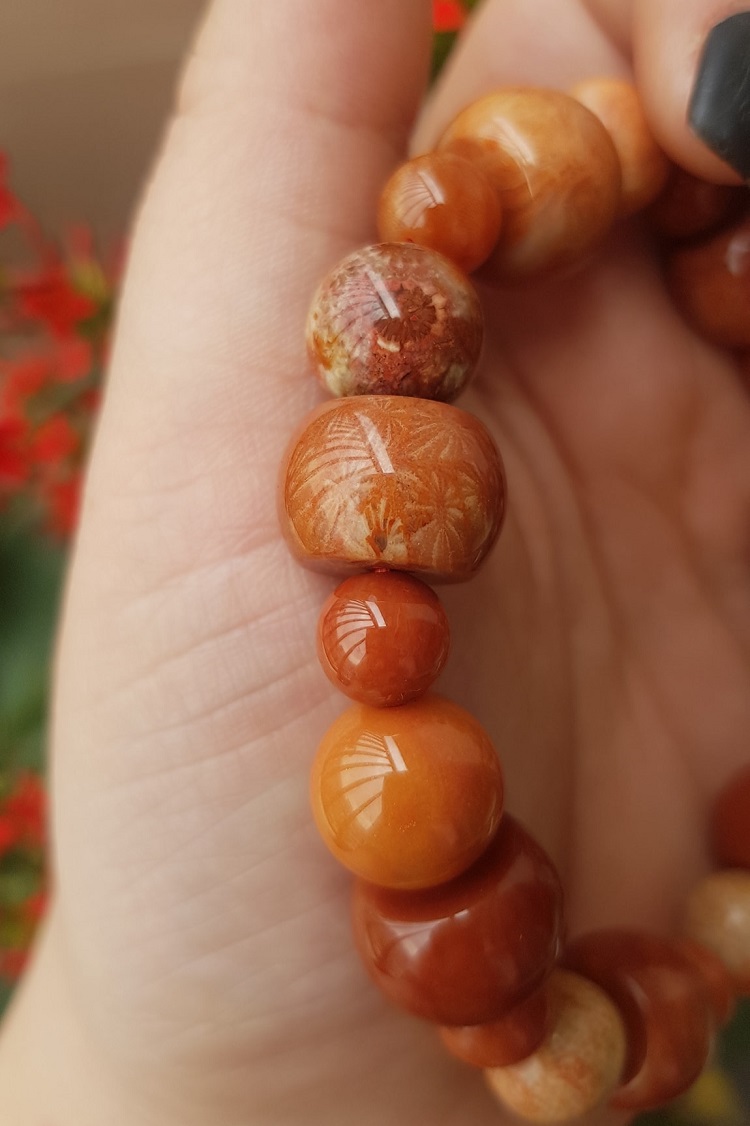 Vòng tay ngọc san hô hóa thạch là phụ kiện không thể thiếu của những bạn nam, nữ có tính cách yếu đuối, kém an toàn, dễ nản lòng, giúp họ có những thay đổi tích cực hơn trong cuộc sống. San hô hóa thạch đã trải qua quá trình thạch anh hóa hàng nghìn năm và trở thành một loại đá nên nó tượng trưng cho sự tái sinh, trường tồn và vĩnh cửu.